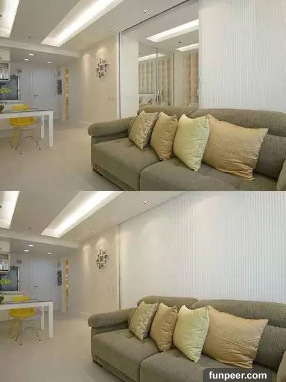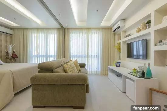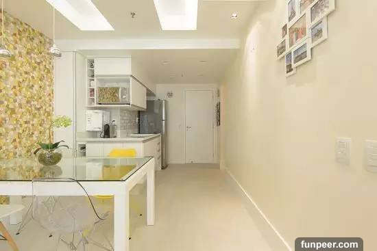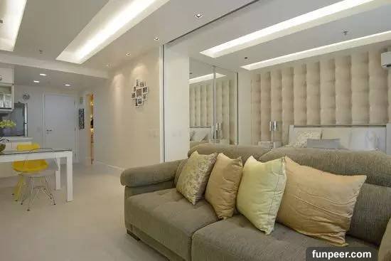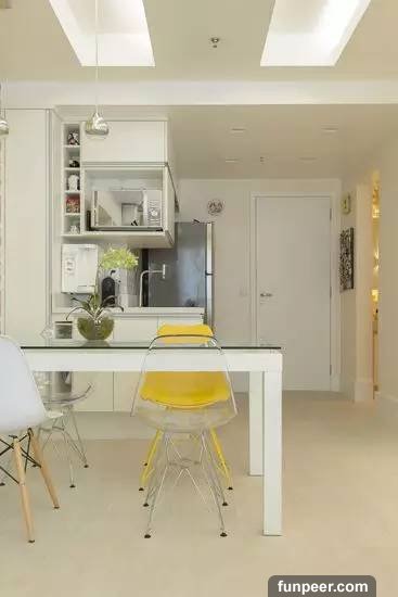 設計師來說是個很大的挑戰,這間45平的小戶型從整體上達到了這種效果。由於室內空間有限,設計師省去了功能區之間的隔斷設計以營造寬敞的空間感,白色的背景牆、