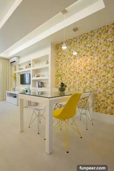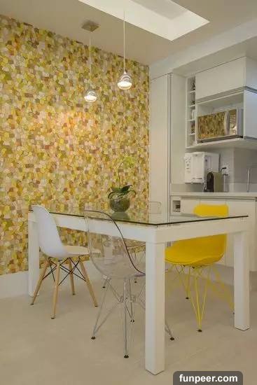色彩繽紛的牆紙裝飾餐廳背景牆,讓餐廳區顯得十分突出和亮眼,也有效地提升了空間的活力。