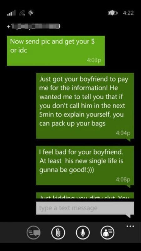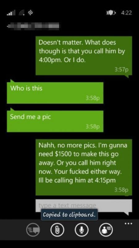 「沒照片給妳了,妳現在不給我1500美元,或立刻打給他,我會在4:15打給他,不管怎樣妳都完蛋了。」▼