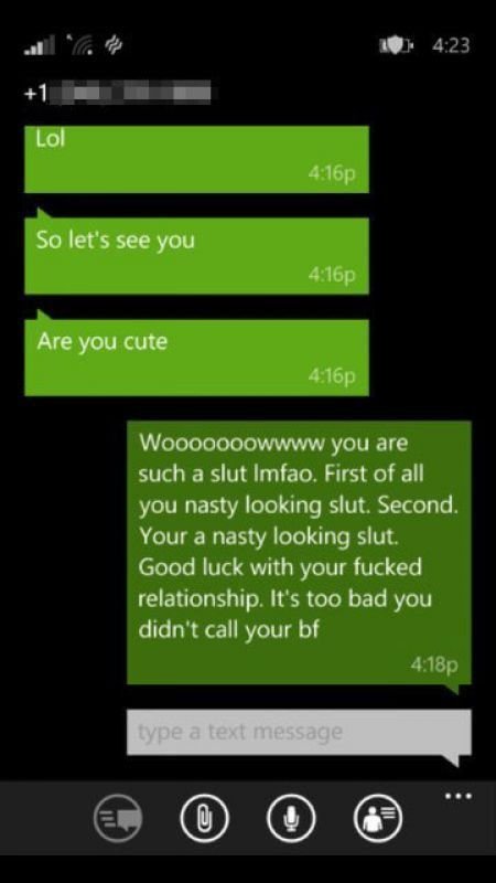 「哇…你真的是一個臭婊子,而且又長得噁心。祝妳跟妳要完蛋的感情好運,妳沒打給男友太可惜了。」▼