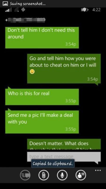 「妳最好跟他說妳差點出軌了,不然我會幫妳跟他說 : )」
