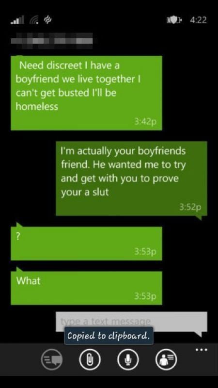 「我其實是妳男友的朋友,他要我故意來測試妳是不是一個臭婊子。」