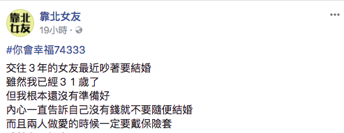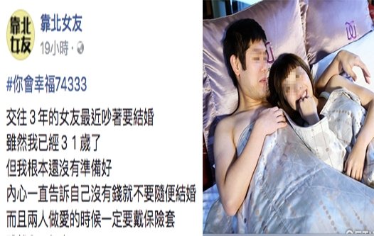 有鬼的人真的一問就被問出來了。日前有網友在臉書「靠北女友」表示,女友最近瘋狂吵著要結婚,自己雖然已經31歲,但其實還沒有步入禮堂的準備,內心也一直告訴自己,在還沒有經濟能力之前,一定要把持住,每次上陣都一定會戴好戴滿,只是沒想到女友卻還是懷孕了...