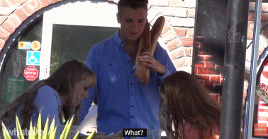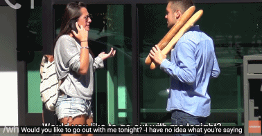 一直以來,很多人都覺得法語很浪漫,這個會說法語的小哥就說著法語,在大街上勾搭起了那些只懂英文的妹子... 啥也不用準備,就抱著根麵包上場了..