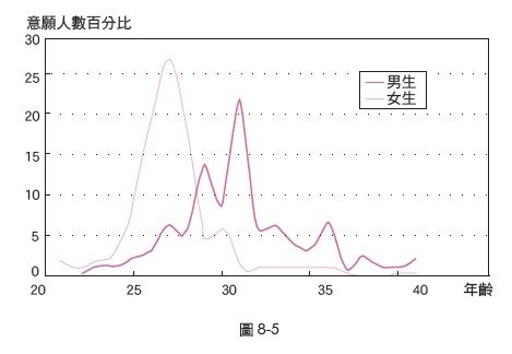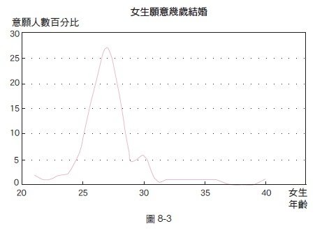 從我曾做過的一項調查中也可以看出,女生們二十六歲一過,便已經達到想要結婚的高峰期了,如下圖8-3所示。