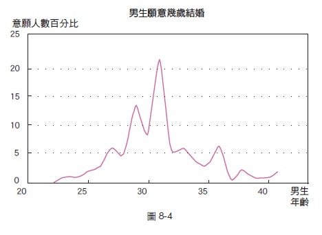 而男生卻要到二十八歲,才會有比較多的人想結婚;如果他們二十八歲沒結婚,他們毫不介意拖到三十歲;如果他們沒在三十歲結婚,他們的意願會持續走低;享受人生到三十五歲,才又有一個結婚意願小高峰,如下圖8-4所示。