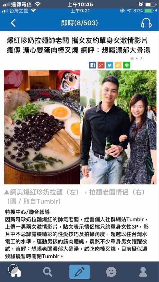 有間限量嘅「珍珠奶茶拉麵」,採用鮮奶茶做湯底,配上珍珠QQ口感,新奇又好玩。拉麵好食,老闆和老闆娘仲係男帥女美高顏值,因此有排爆紅。而最近剛好也有條啪啪影片在Tumblr上瘋傳,據傳影片中啪啪啪男女主角就係呢間拉麵店情侶檔約人3P嘅激戰過程。閱讀全文