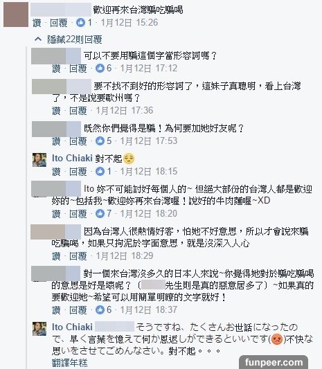 許多網友見狀都替她抱不平:「妳不可能討好每個人的,但絕大部分的台灣人都是歡迎妳的」、「不要管別人怎麼說,做自己想做的就對了,台灣歡迎妳」、「歡迎再度光臨,到台南我招待」、「下次來彰化,彰化三寶就是滷肉飯、肉圓、貓鼠麵,還有大佛」。