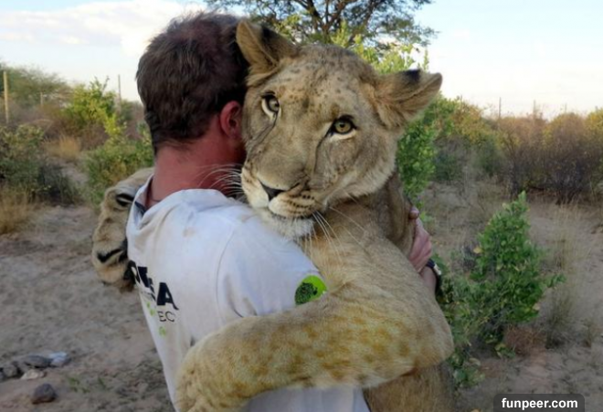 保育員常常帶小獅子去玩耍、曬曬太陽,小獅子柔柔的靠在他們的懷裡,感覺就像是一家人一樣友愛。隨著時光流逝,小獅子長大了,必須把牠送回保護區,天下無不散的筵席啊……等到保育員再度探望獅子時,牠們已經變成威風凜凜的成年獅(耳邊響起獅子王主題曲)。獅子看見兩位保育員時,突然變得超興奮!就算現在牠的體型很巨大,還是忍不住撲過去。