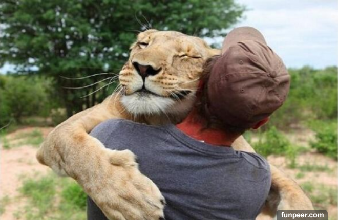 希望所有動物,不管是不是萬獸之王,還是家中可愛的毛孩子,都擁有愛護牠們的主人。希望大家一起努力,把地球變成動物安居樂業的家園。獅子雖然無法講話,可是千言萬語都包含在這個溫馨的擁抱當中了。(點播一首鄧麗君的千言萬語當背景音樂)
