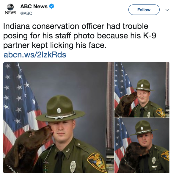 ▼印第安納州的保護官在拍照時遇到了一點難題,因為他的警犬夥伴不斷亂入舔他的臉。