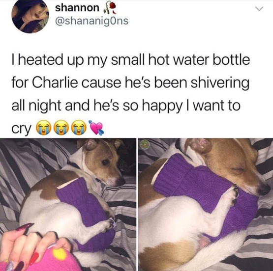 ▼小狗查理因為寒冷,整晚都在發抖。我把熱水壺加熱了給牠取暖,看到牠開心的神情讓我快哭了。