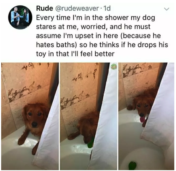 ▼每當我洗澡的時候,我家的狗狗都會這樣擔心的看著我,覺得我也很不開心,因為牠也討厭洗澡。為了讓我心情好過一點,牠帶來了自己的玩具。