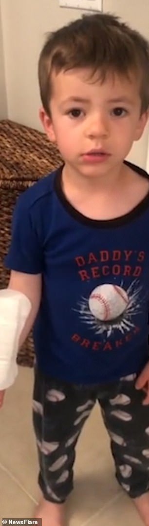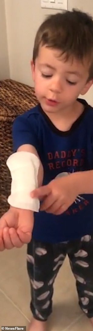 ▼那天早上媽媽正在化妝,爸爸則在洗澡。Brody跑進來告訴媽媽,自己從姊姊的浴室裡找到一塊超大ok繃。他解釋說:「這是我從姊姊那裡借的,就借了一塊!這塊超大ok繃把整個手臂都包住了!」