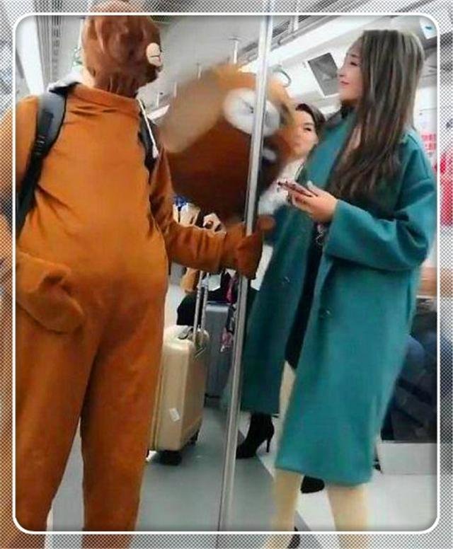 相信大家對於地鐵不會太陌生,地鐵是上班族比較便利的代步工具,很多人都喜歡坐地鐵,不僅僅是方便,便宜,還可以在地鐵上看到很多不同的人,還可能在地鐵上看到很多有意思的事,就像下面這一位,一個穿著小熊套裝的人,站在美女的旁邊,美女也是比較淡定的,沒有任何的害怕,但是小熊卻是很調皮的樣子,直接拍了一下美女的後背,不得不說,真的是比較老套的搭訕方式了!