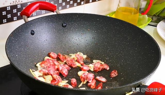 5、起鍋加油,油溫五成熱,放入薑絲和蒜片,爆出香味後,放入一勺豆瓣醬,豆瓣醬炒出紅油,倒入臘腸。