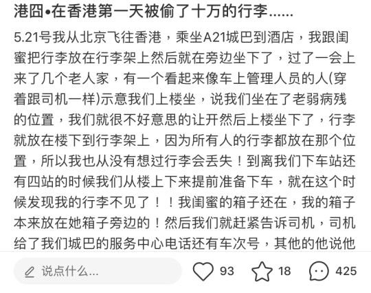無特別注意行李該內地女子在文中指事發於上月的21日,當日她從北京抵港,到埗後便搭城巴A21前往酒店,她和朋友將行李放在行李架上便坐在座位上,更不小心坐到「老弱病殘」的座位(即關愛座),感到不好意思後便讓開去了上層坐下。途中亦無特別看顧過行李,但下車時發現行李不見了,指「閨蜜的箱子還在,我的箱子本來就放她旁邊的。」