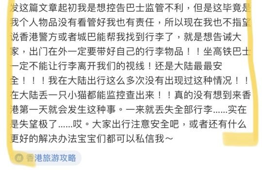 內地女事主原文1控訴巴士公司監管不力內地女指對巴士公司及警方沒法提供協助非常失望,已經不指望他們能協助找回行李,同時告誡網民一定要注意自己的隨身物品,不要讓行李離開視線。