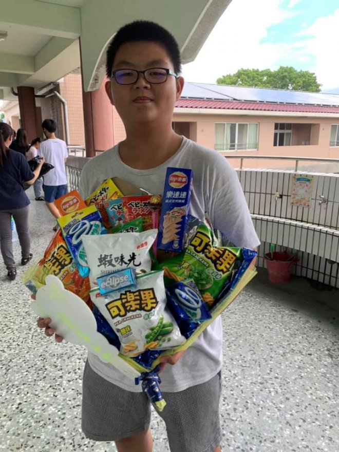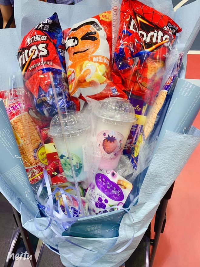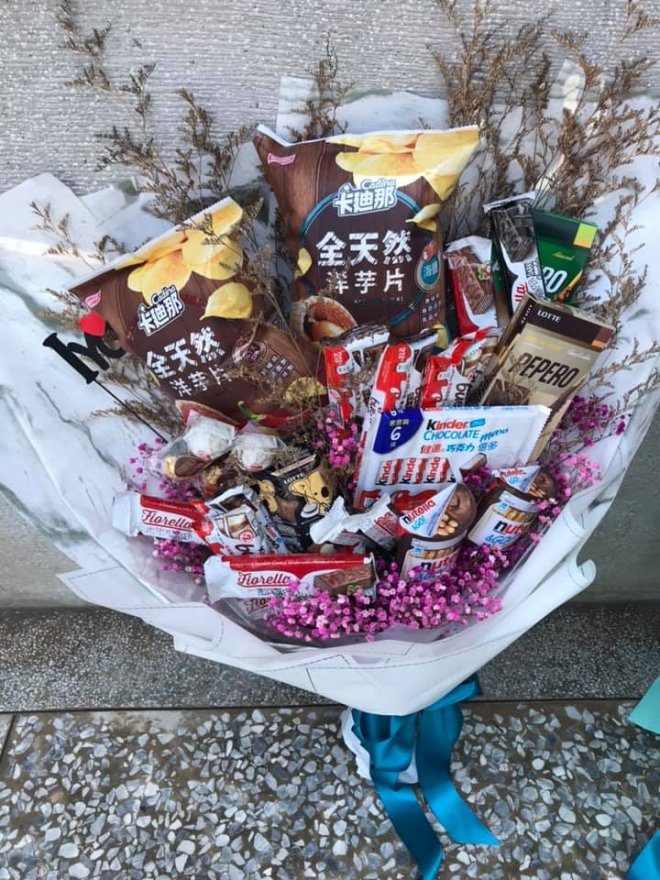 也有人在下面分享自己看過的有趣花束,首先是比較普遍的「零食花束」,