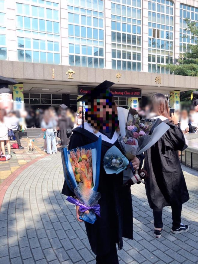 只見他身著全套學士服、開心的拿著兩大束花在學校禮堂前拍照,不過有人注意到雖然她的左手抱著普通乾燥花束,右手的花束卻好像有點怪怪的...?