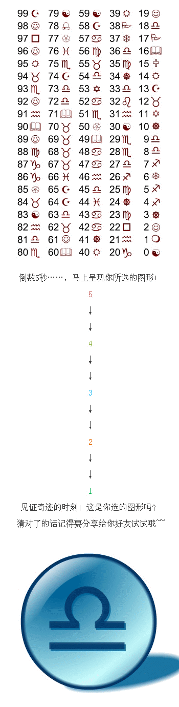 選擇任意一個兩位數(即從10—99之間任意選擇一個數),把這個數的十位與個位相加,再把任意選出的數減去這個相加得出的和。例如:你選的數是23,則2+3=5,然後23-5=18然後在下面圖表中找出與最後得出的數所相應的圖形,並把這個圖形牢記心中,最後拉到下面顯示出來的圖形就是你剛剛心裡記下的那個圖形。
