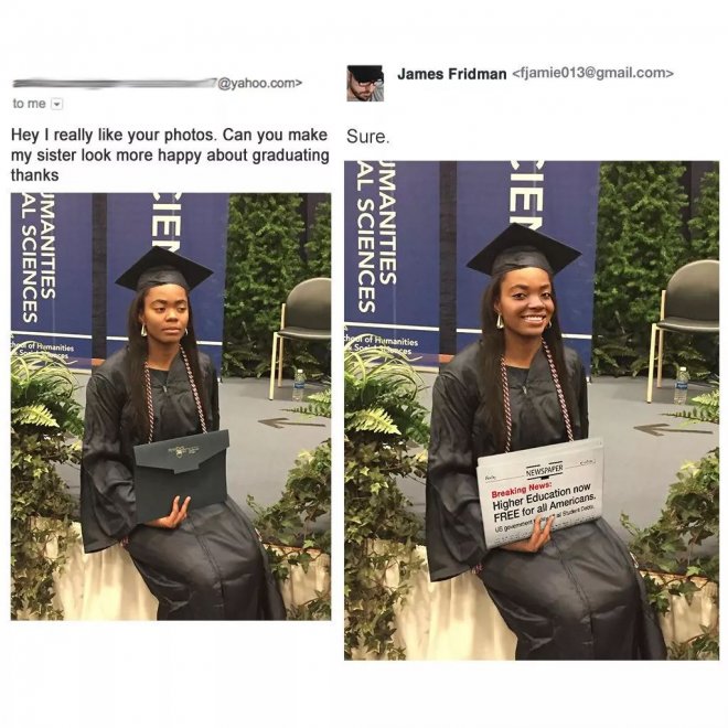 網友:你能把我妹妹的畢業式P得更開心一點嗎?