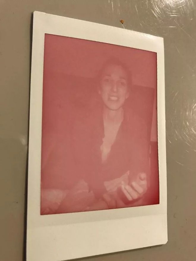 很自然的,毫不知情的老婆就拿起來他們的拍立得,打開了一盒相機紙放進去 (注意,是她自己打開放進去的),在他的指示下拍了兩張照片。