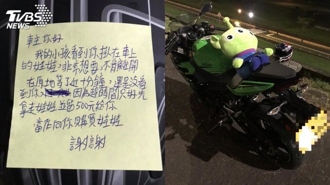 他也還原整個狀況,他當時外出用餐,將黃牌重機停在停車場中,回來就看到油箱蓋夾了一張紙條寫「車主你好,我的小孩看到你掛在車上的娃娃,非常想要,不肯離開,在原地等了近10分鐘,還是沒看到你,因為趕時間只好先拿走娃娃,並留500元給你,當作向你購買娃娃,謝謝!」,更讓人傻眼的是,原PO找半天根本就沒看到500元鈔票......