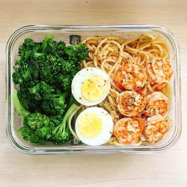 白酒鮮蝦義大利面、花椰菜& 水煮蛋