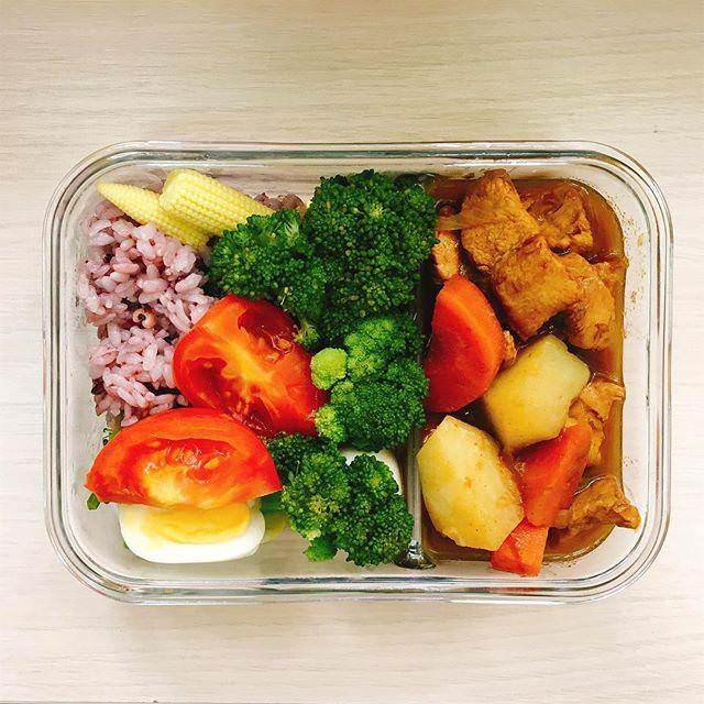 五穀飯、花椰菜、番茄、玉米筍、水煮蛋& 咖哩雞