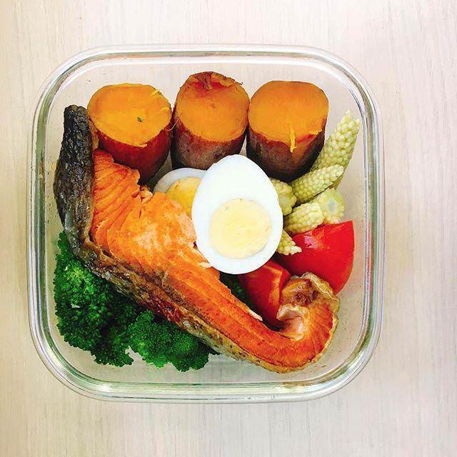 番薯、花椰菜、玉米筍、番茄、水煮蛋& 香煎鮭魚