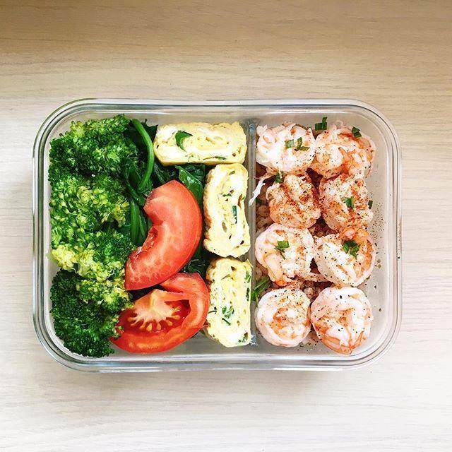 五穀飯、花椰菜、番茄、菠菜、蔥蛋捲& 川燙白蝦