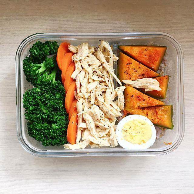 五穀飯、花椰菜、蘿蔔、水煮蛋、雞絲& 南瓜