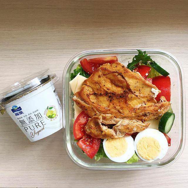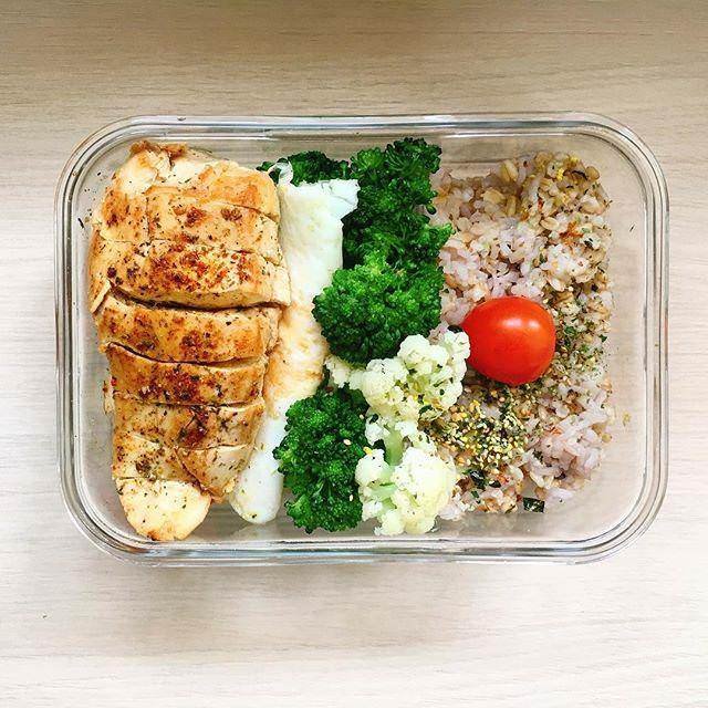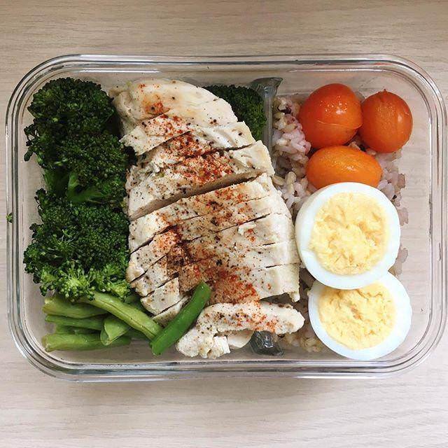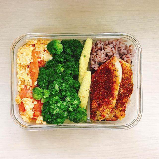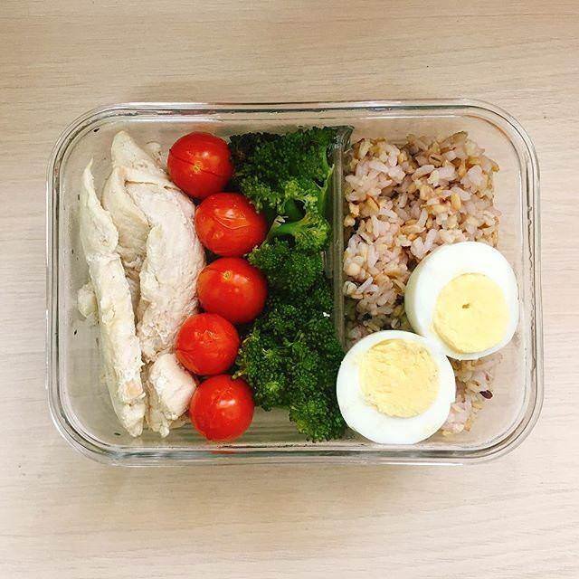 五穀飯、花椰菜、 小番茄們、水煮蛋& 燙水雞胸肉