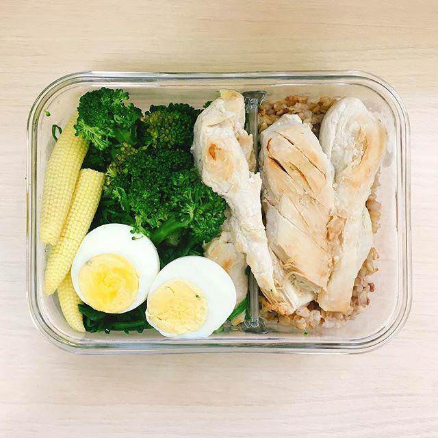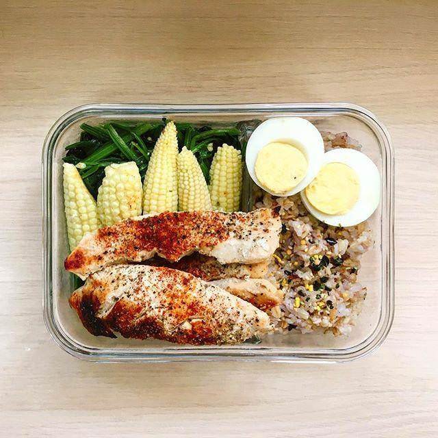 五穀飯、花椰菜、玉米筍、水煮蛋& 香煎雞胸肉