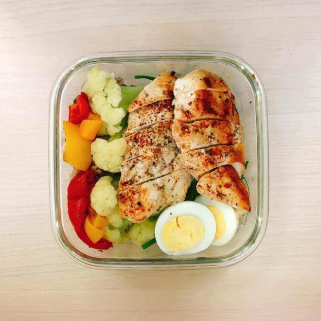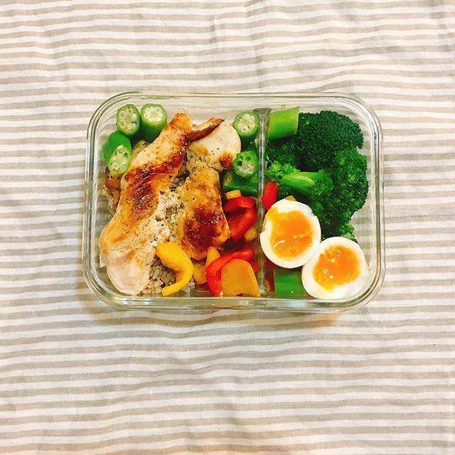 五穀飯、花椰菜、燈籠椒、羊角豆、水煮蛋& 香煎雞胸肉