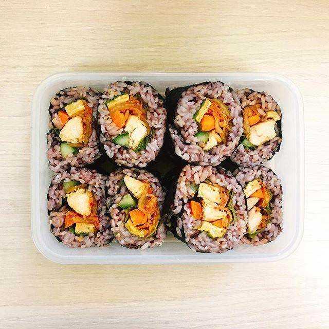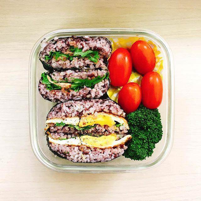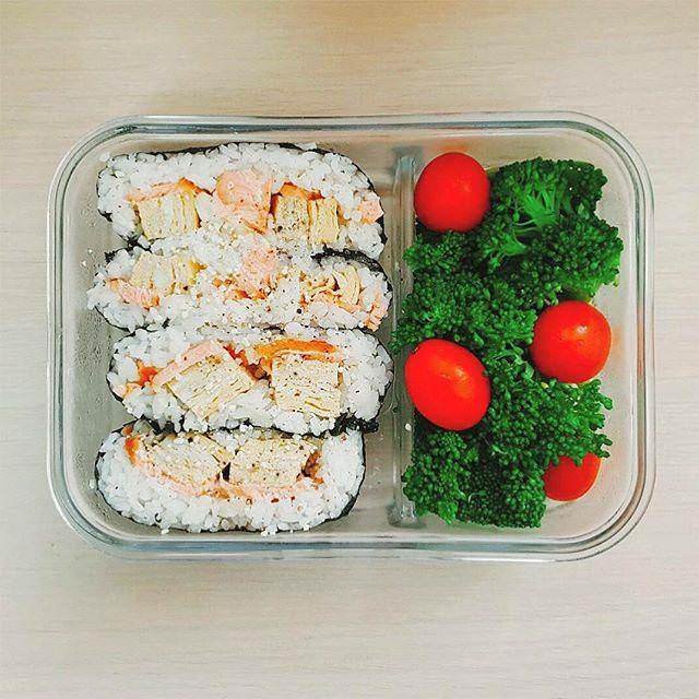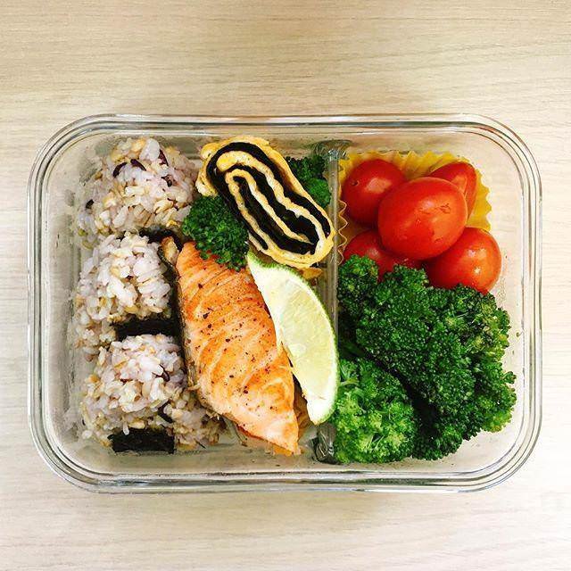 五穀飯糰、花椰菜、 小番茄們、 海苔玉子燒(蛋捲) & 香煎鮭魚