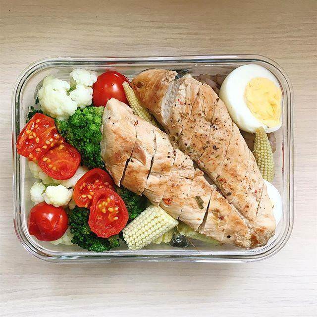五穀飯、花椰菜、菜花、玉米筍、水煮蛋、香煎雞胸肉& 小番茄們