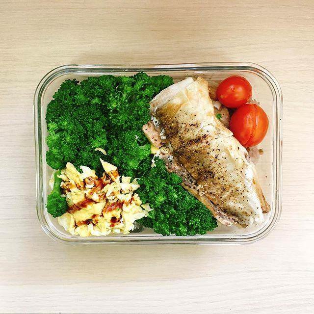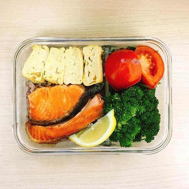 五穀飯、花椰菜、番茄、 香煎鮭魚& 蛋捲