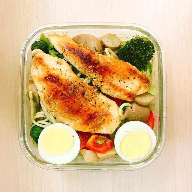 羅勒義大利面、花椰菜、水煮蛋& 香料烤雞