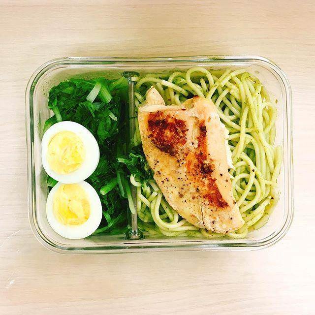 羅勒義大利面、菠菜、水煮蛋& 香煎雞胸肉
