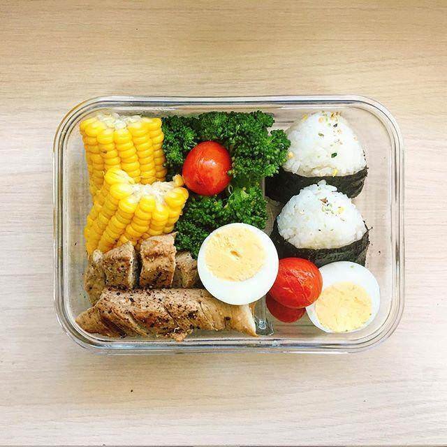 飯糰、花椰菜、小番茄們、水煮蛋、燙水玉米& 照燒雞胸肉