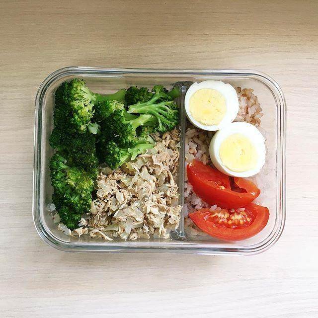五穀飯、花椰菜、水煮蛋、水煮鮪魚& 番茄