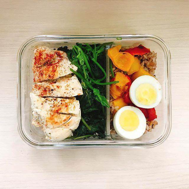 五穀飯、燈籠椒、菠菜、水煮蛋& 香煎雞胸肉