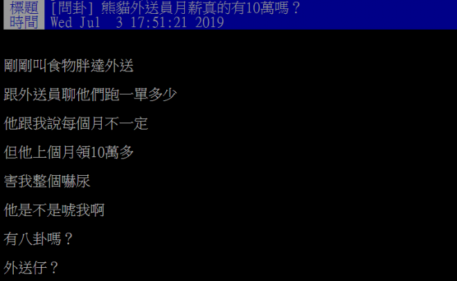 日前卻有一位網友在批踢踢發文表示,他在和foodpanda外送員閒聊期間,