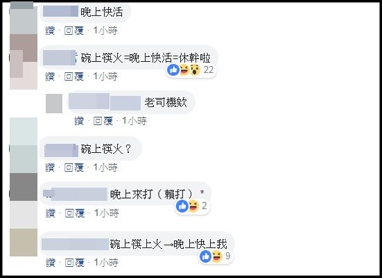 原PO一發問,老司機網友紛紛專業解答說,「碗上筷火=晚上快活=休X啦」、「乾柴烈火……晚上有得爽了」、「今晚吃雞,大吉大利」、「筷上火=快上我」、「晚上來打(賴打)」、「晚上補充體力」。