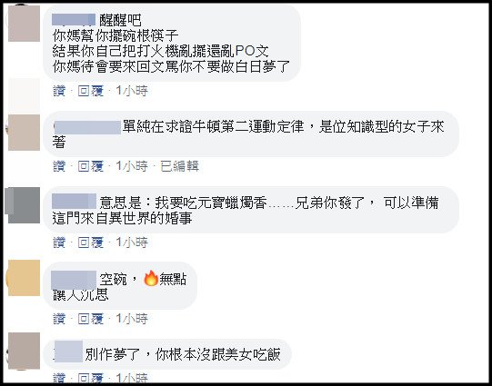 也有人認為,「單純在求證牛頓第二運動定律,是位知識型的女子來著」、「意思是:我要吃元寶蠟燭香……兄弟你發了,可以準備這門來自異世界的婚事」、「她想送你上山頭…小心囉」、「快上香,吃腳尾飯」、「不要動她的碗筷」、「東西太難吃,她根本不想吃,感覺很火大」、「停止你大膽的想法」。