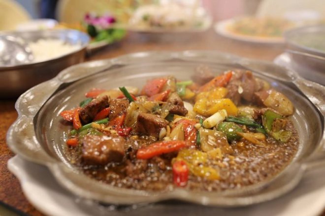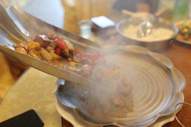 服務人員竟然頭戴工地帽、手拿鏟子、產出做好的牛排,現場鏟入熱騰騰的鐵板上~超猛的啦!