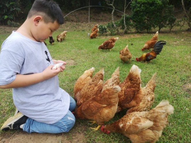 更妙的是這些雞只要看到小朋友走過來,似乎認得我們手上的飼料