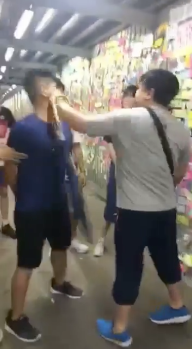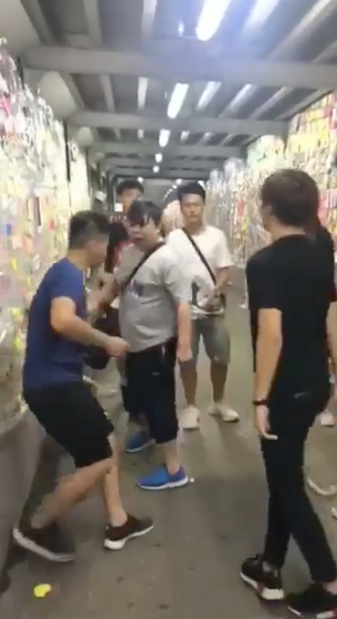肥佬廢中拆連儂牆(影片截圖)環拳重擊「反送中」人士頭部 拳拳攞命雙方除了言語衝突,更發生打人事件!就影片所見,肥佬向一名身穿藍色衫嘅36歲男義工嘅頭部連環揮拳,出手極重,拳拳攞命!仲打到藍衫男一度企不穩倒地,藍衫男身邊嘅另一位男義工亦有中拳,事件中還有另一名65歲義工中拳,事後警方到場,拘捕肥佬。